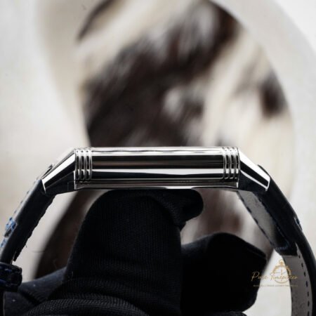 Fitted inside a stainless-steel rectangular case, the design maintains the classic Reverso proportions known for sharp lines and iconic geometry.