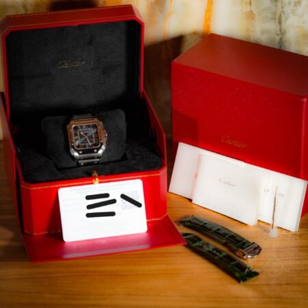 This example of the Cartier Santos WSSA0062 Green Dial is offered as a like new condition full set dated 2025. Notably, it remains in pristine condition, with factory stickers potentially still intact depending on handling. Therefore, it is presented in collector-grade condition, making it highly desirable in today’s competitive market. Overall, this model delivers a perfect combination of iconic design, technical reliability, and modern luxury appeal.
