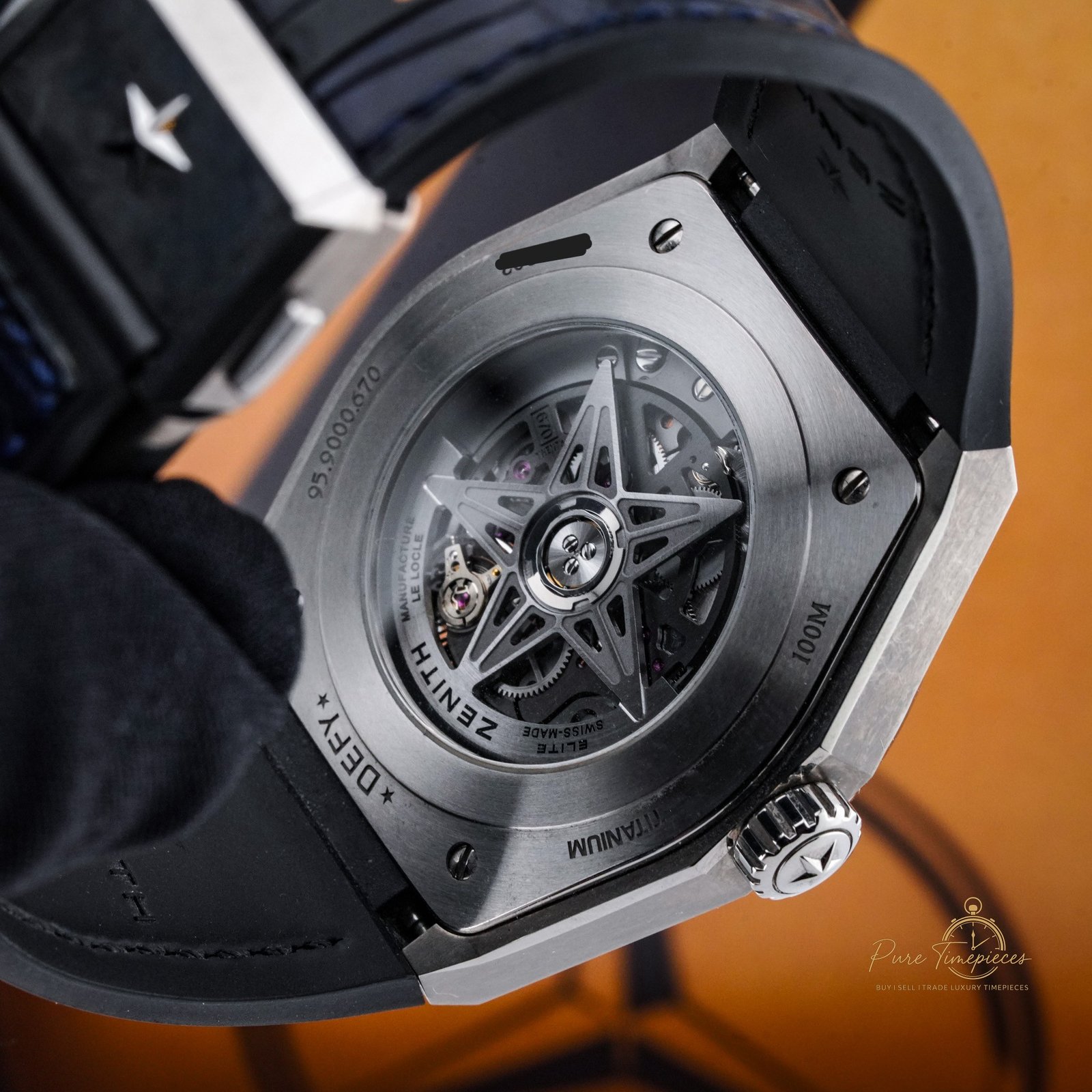 Zenith designed the Defy Classic Skeleton to showcase contemporary watchmaking innovation with a striking openworked dial. This reference 95.9000.670/78.R584 combines lightweight titanium construction with an architectural skeletonized movement that reflects Zenith’s modern design philosophy.